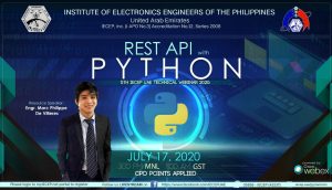 IECEP UAE 5th Technical Webinar 2020 (FREE) with live streaming on IECEP UAE Facebook Page Topic: REST API with Python Resource Speaker: Engr. Marc Philippe G. De Villeres Date: July 17, 2020, Friday Time: 11:00 AM