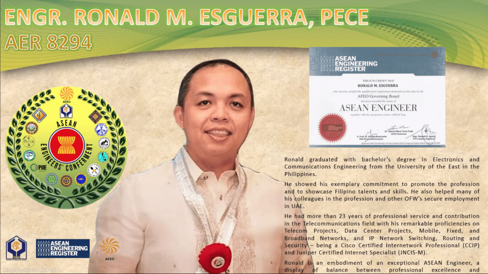 Ronald is an embodiment of an exceptional ASEAN Engineer, a display of balance between professional excellence and humanitarian ideology. He will be remembered and will continue to inspire Filipino Professionals and aspiring Telecom Engineers.