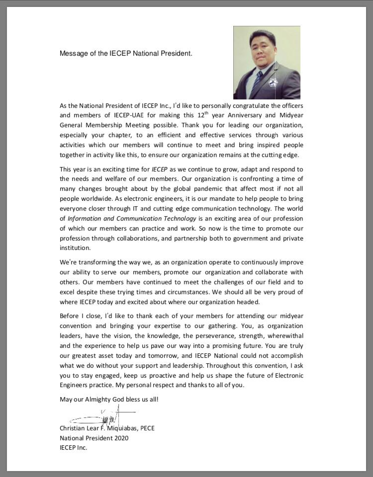 A message from IECEP National President – Engr. Christian Lear F. Miquiabas, PECE