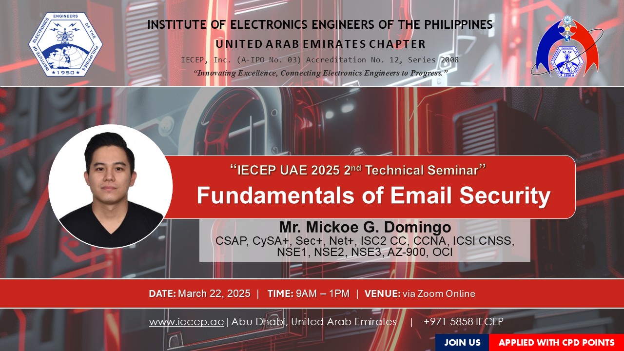 Join us at the IECEP UAE 2025 2nd Technical Seminar on March 22, 2025 (9 AMโ1 PM) for an in-depth session on Fundamentals of Email Security!