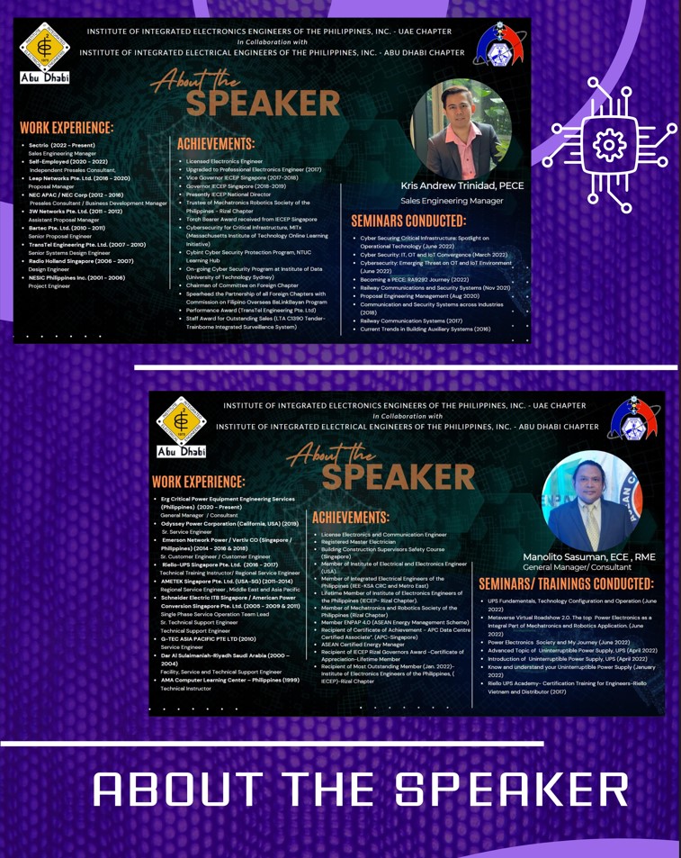 We would like to introduce to you our speakers, Engr. Kris Andrew Trinidad, and Engr. Manolito Sasuman for our topics “The Gap on Cyber Security in Critical Infrastructures” and “Power electronics and Electric Motors as integral parts of Robotics” respectively.
