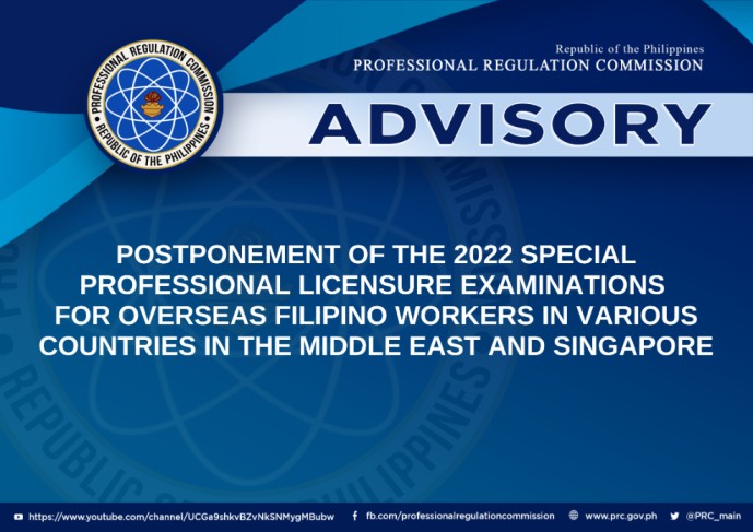The Professional Regulation Commission (PRC) informs the public that the conduct of the 2022 Special Professional Licensure Examinations (SPLEs) for Overseas Filipino Workers in various countries in the Middle East and Singapore has been postponed due to the global uncertainties caused by the COVID-19 crisis and likewise to ensure the health and safety of the prospective examinees and the PRC delegates.